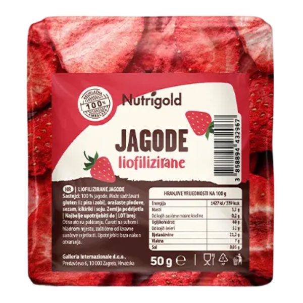 Nutrigold liofilizirane jagode punog prirodnog okusa svježeg voća u praktičnom i hrskavom obliku. Zahvaljujući procesu liofilizacije, zadržavaju aromu, boju i nutritivne vrijednosti – bez suvišnih dodataka. Savršene su kao zdravi snack, dodatak doručku, smoothiejima ili desertima. Lagane, praktične i intenzivnog okusa, idealne su za svakodnevnu užinu. Uz Nutrigold, birate čistu voćnu kvalitetu.
