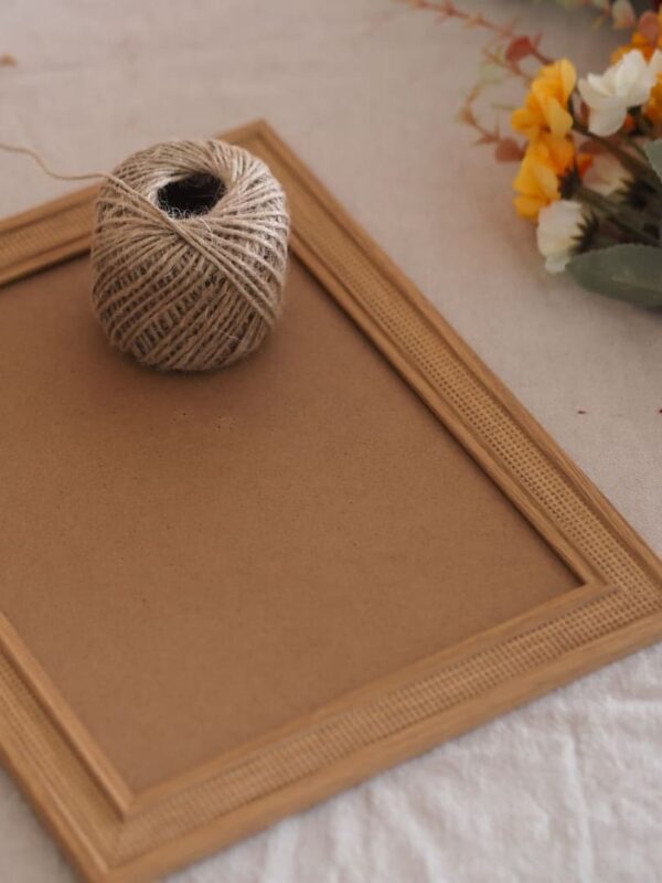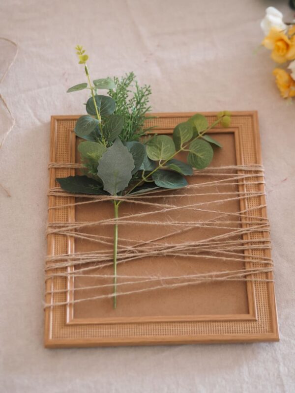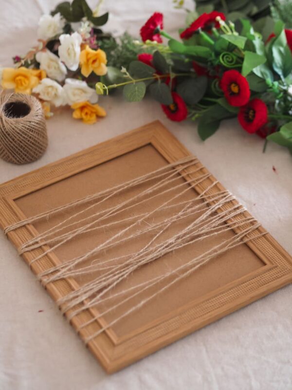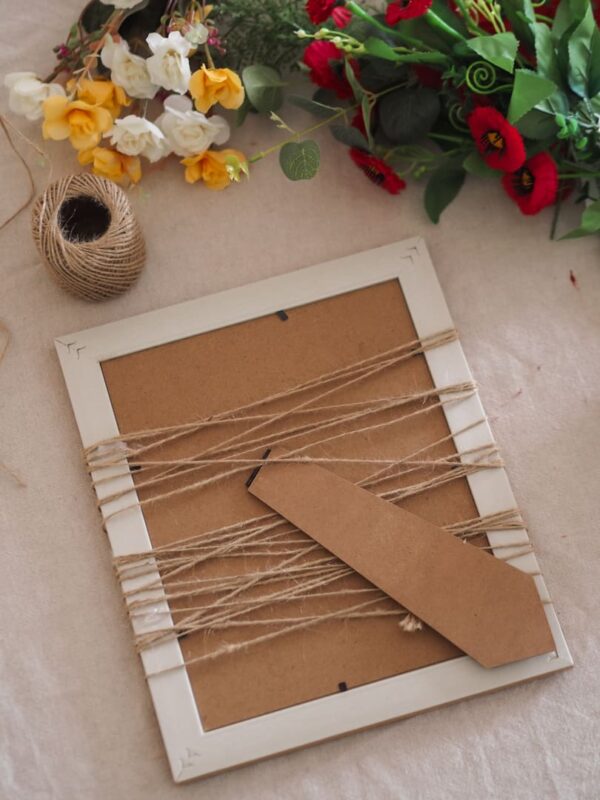 Sada treba omotati špagu. Početak špage zalijepite sa zadnje strane okvira i omatajte “neuredno”, neka se špaga slobodno preklapa. Ukoliko želite da okvir može stajati samostalno, onda pazite da vam “nogica” ostane slobodna. Špagu možete na nekoliko mjesta fiksirati ljepilom kako se ne bi pomicala i, obavezno, na kraju.