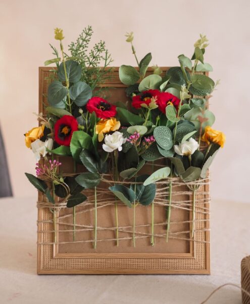 Preostalo je samo rasporediti umjetno cvijeće. Ukoliko su buketi veliki, razdvojite na manje grančice kako bi se ljepše uklopilo. Popunite koliko želite, dok niste zadovoljni izgledom.