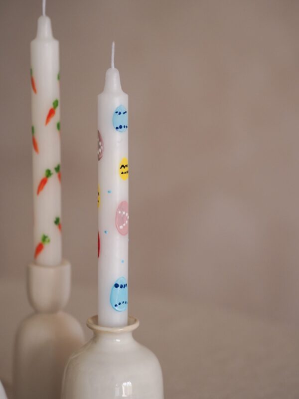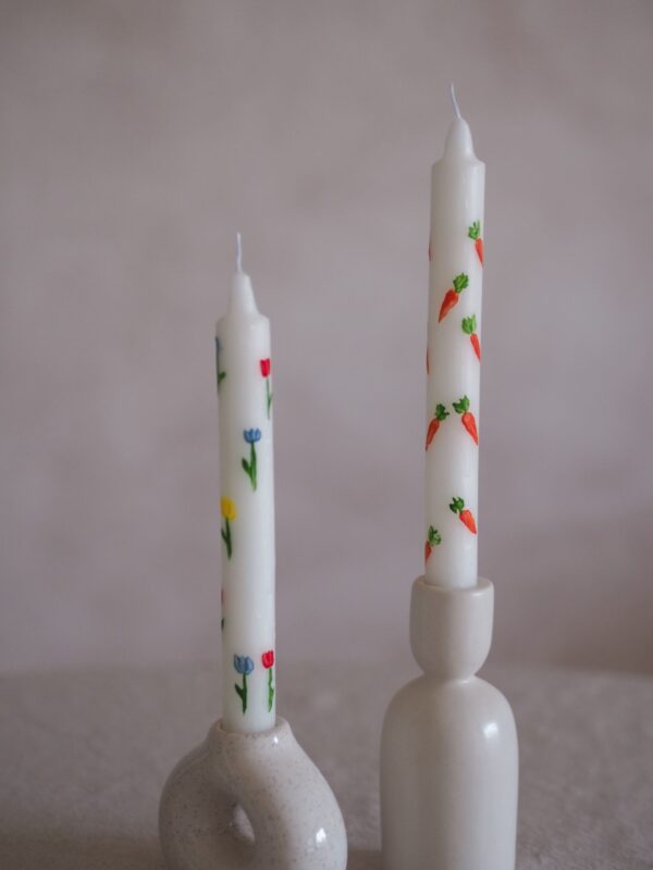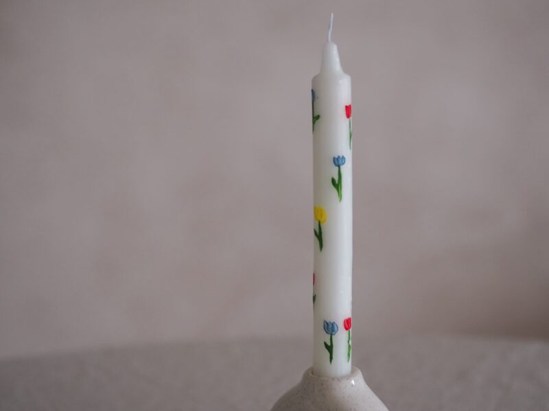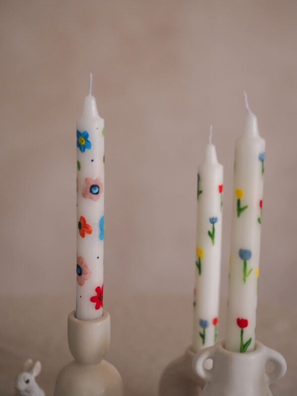 Važno je da slažete element po element na svijeću kako bi se prethodni sloj već malo posušio i kako se ne bi razmuljala boja. Na primjeru tulipana – prvo sam nacrtala latice (jednu po jednu boju) i tek onda sam išla crtati stabljiku svim tulipanima. Na kraju, to vam je i jednostavnije jer ne morate stalno mijenjati ili prati kist. Crtajte što tanjim kistom, kako bi bili precizniji.
