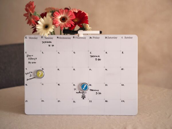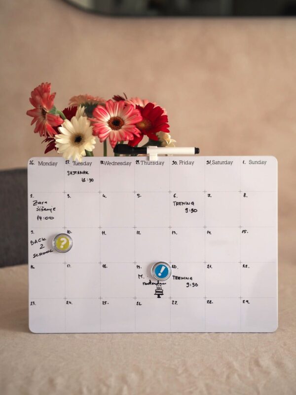 Glavna stvar za organizaciju obiteljskog života i usklađivanje obaveza, posebice ako imate djecu s puno aktivnosti – piši/briši mjesečni organizator. Ovaj ima magnete, može se postaviti na hladnjak što je praktično i svima dostupno.