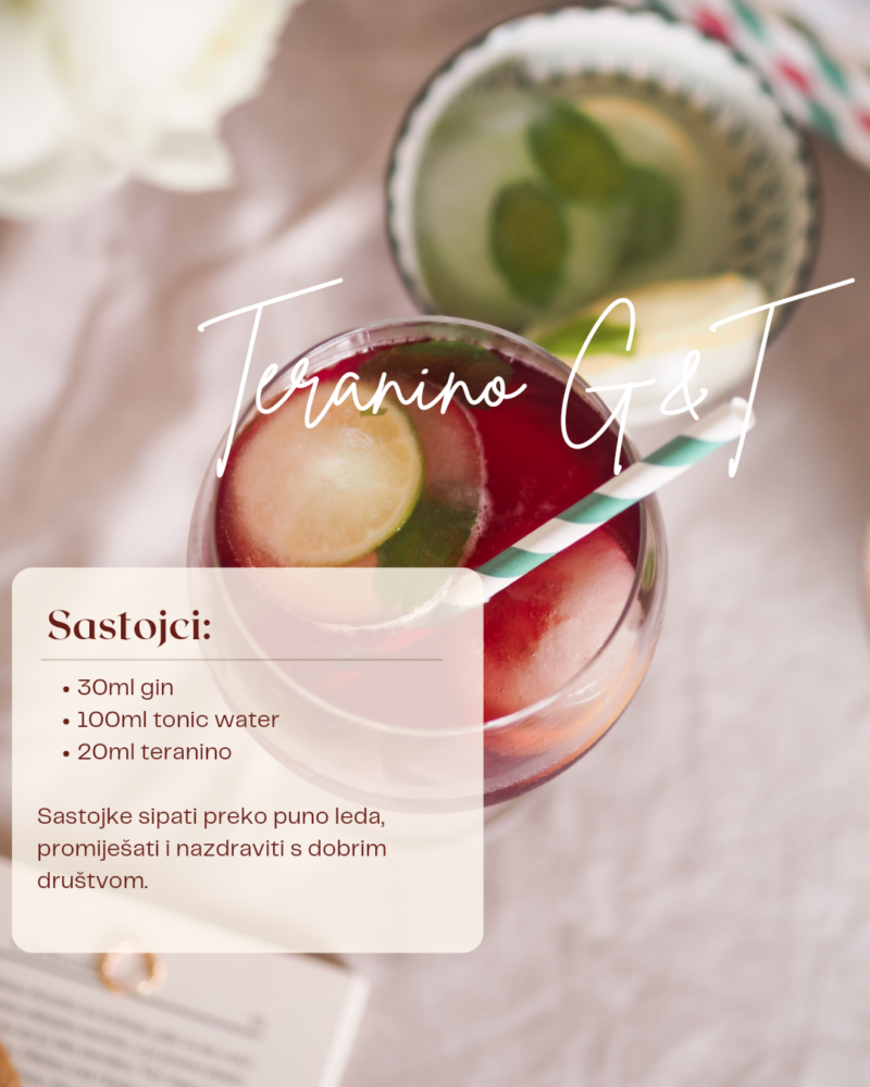 Ljeto je vrijeme kada se više družimo s dragim ljudima, pa češće i nazdravimo nekim finim, rashlađenim pićem. Ja volim isprobavati nove kombinacije i volim svoje goste ponuditi nečim zanimljivim i nesvakidašnjim. Primijetila sam da su ove godine kokteli s teraninom hit, pa sam odlučila isprobati teranino gin – tonic i odmah ga uvrstila u svoje favorite. A kako bi i vi isprobali, zapisala sam vam recept.