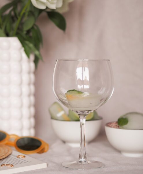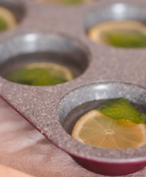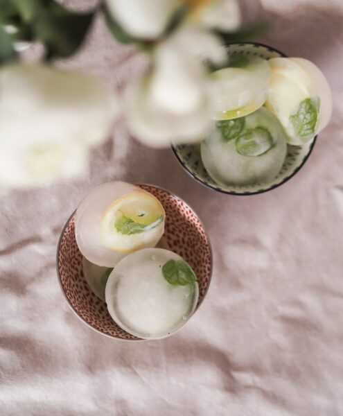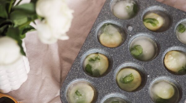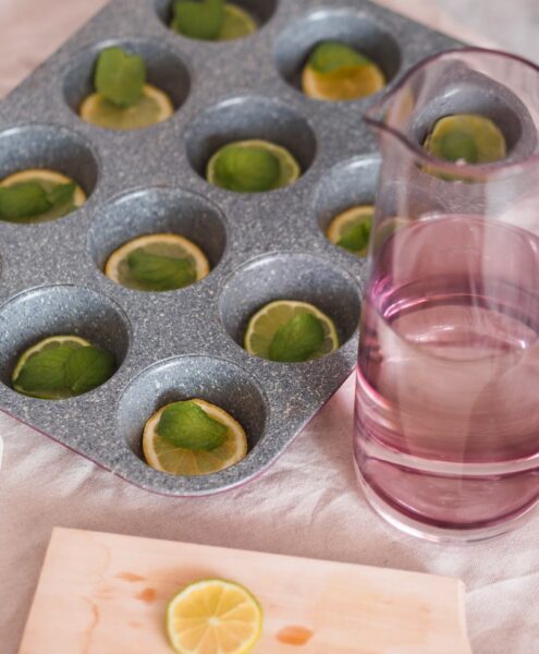 Umjesto običnih kockica leda možete napraviti led u kalupu za muffine te u njega staviti dodatke po želji. Ja sam se odlučila za varijantu s limunom/limetom i listićima mente jer mi ta svježina lijepo paše uz teranino. No, ako radite klasičan gin-tonic, možete u led ubaciti i uobičajene začine poput borovice, zvjezdastog anisa, rozog papra i slično. Isto tako, ako radite neki drugi, voćni koktel – u led možete dodati i borovnice ili neko drugo voće. Mogućnosti su zaista neograničene, a rezultat je jako efektan. Ako tome dodate elegantne, velike čaše za koktele, dojam će biti poseban. Ja sam svoje čaše za gin – tonic pronašla u Offertissimi i one su bile inspiracija za ovaj recept i post.