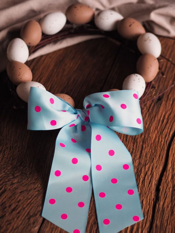 Vrućim ljepilom fiksirajte pisanice na vijenac. Ukoliko planirate staviti mašnu, ostavite mali prostor bez pisanice kako biste lakše vezali traku. Svežite mašnu i vaš vijenac je gotov.
